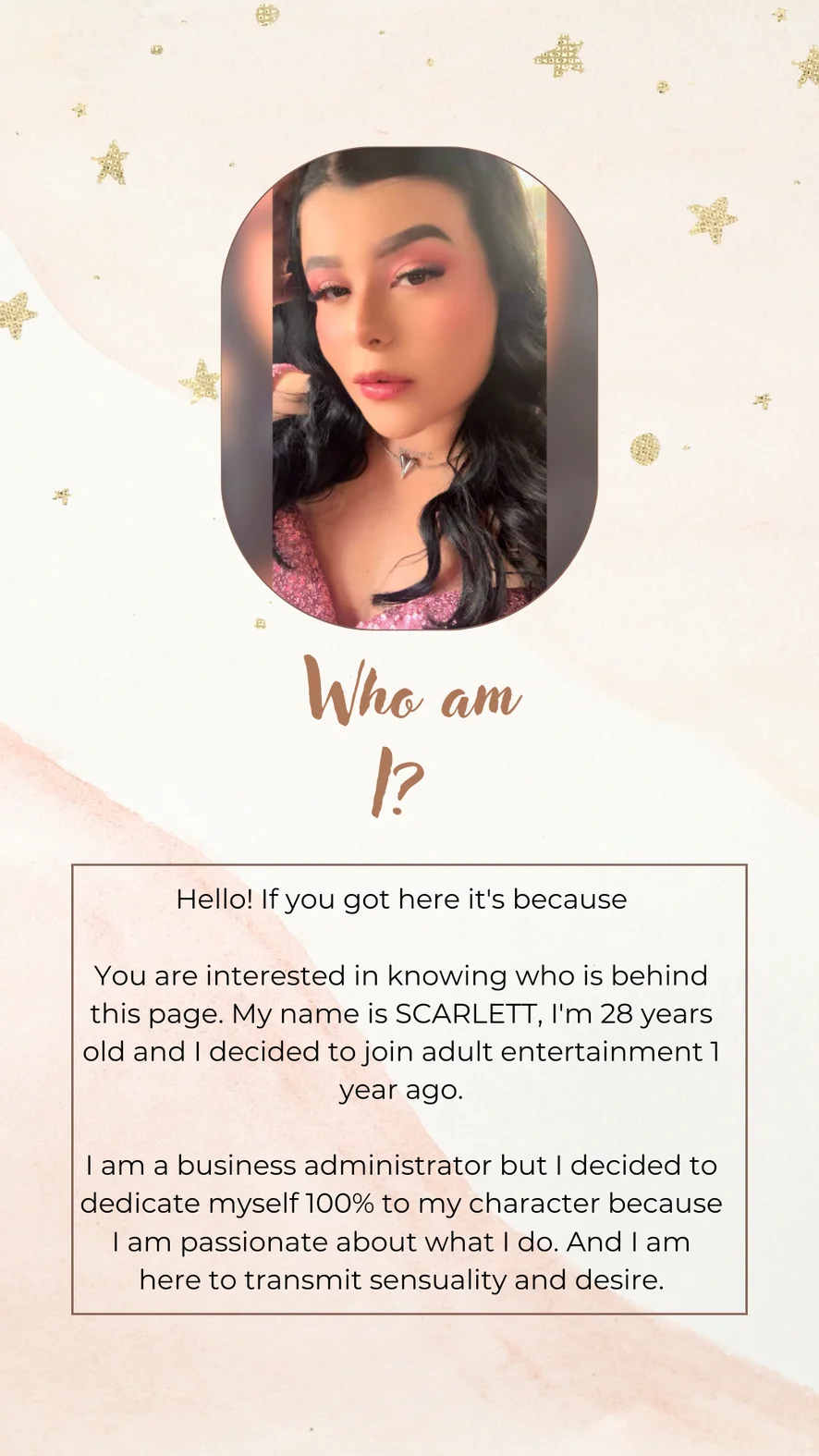 Scarlett, a very sensual woman, has prepared explicit content for you where her ass will be the protagonist. Come and let yourself be carried away by my charms.